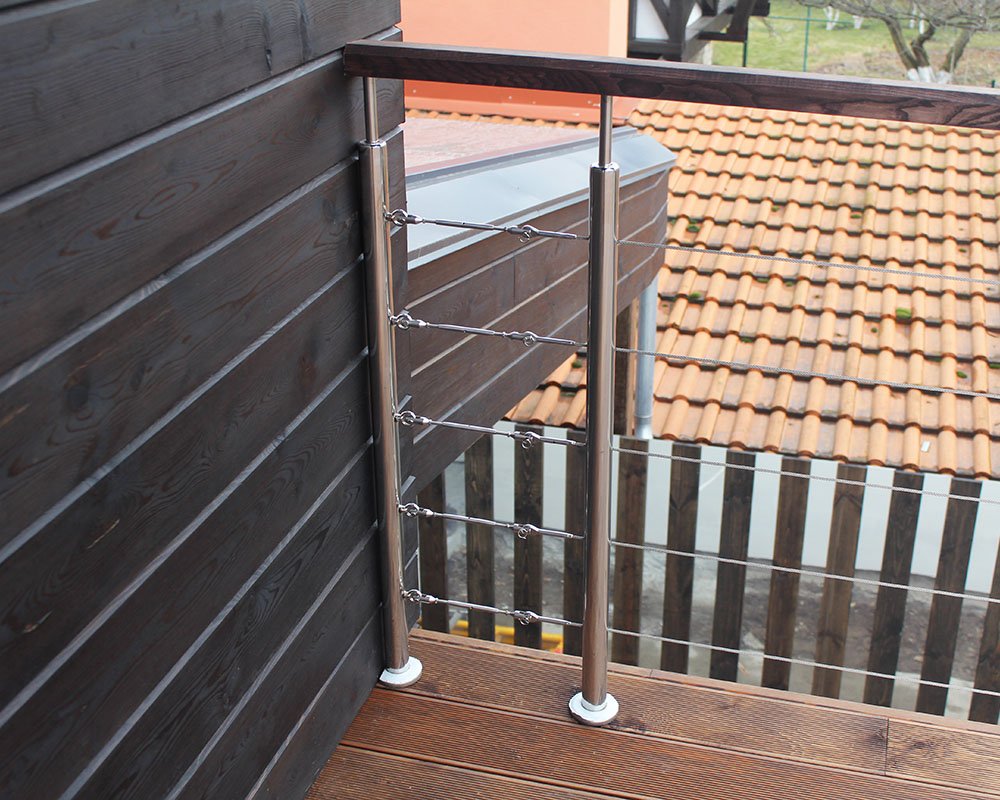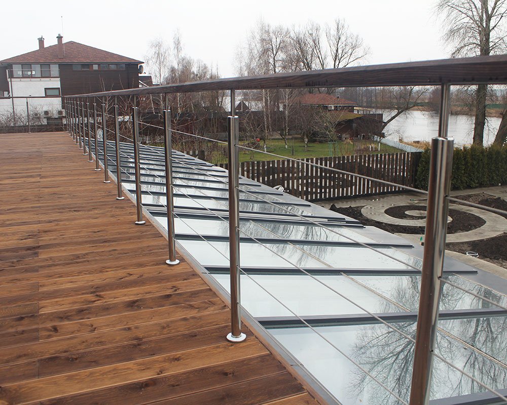 Хотя ограждение с тросами выглядит визуально воздушным, конструкция остаётся устойчивой и прочной. Между стойками натягиваются стальные тросы, которые создают аккуратное горизонтальное заполнение без провисания и сохраняют безопасность при ежедневном использовании.
