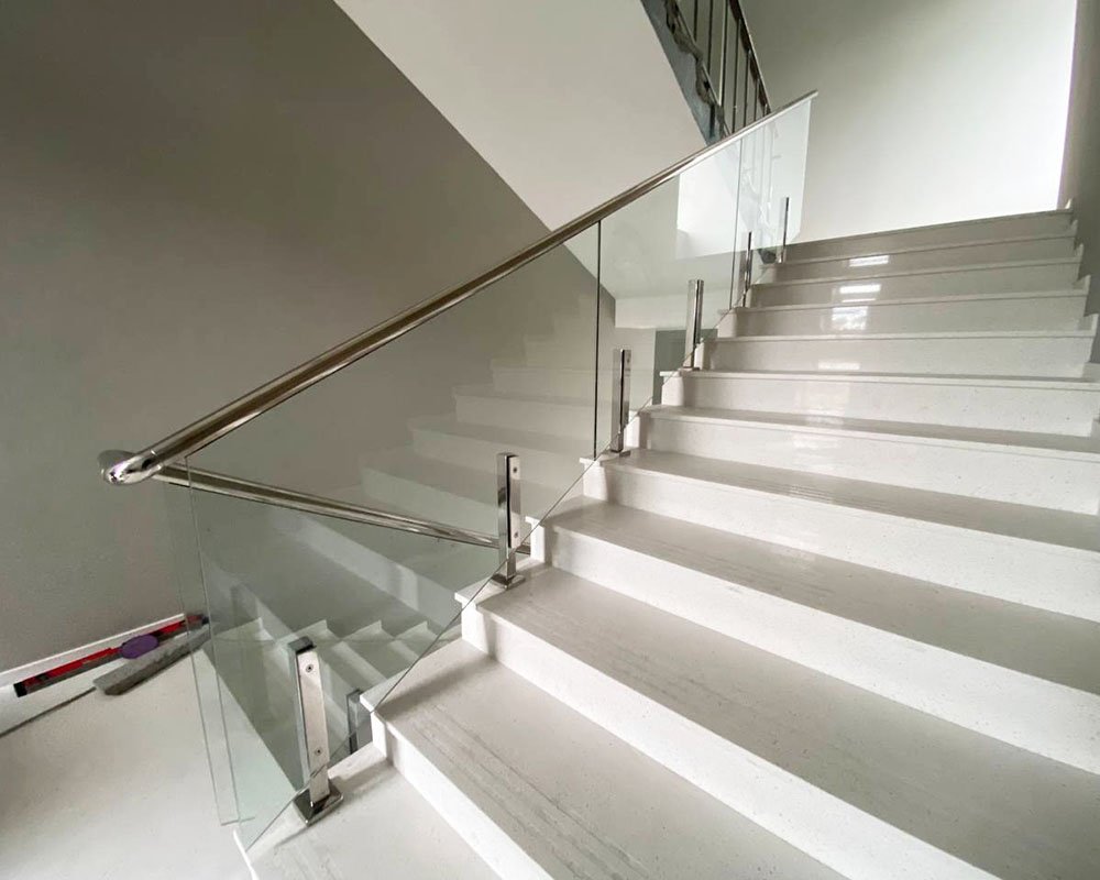 Стекло, используемое в ограждениях, проходит закалку или ламинирование (триплекс), что делает его в несколько раз прочнее обычного. Закалённое стекло выдерживает ударные нагрузки и при разрушении распадается на мелкие безопасные фрагменты, а триплекс остаётся целостным благодаря внутренней плёнке. Для зон повышенной нагрузки мы подбираем усиленную толщину и рассчитанную под объект систему крепления.