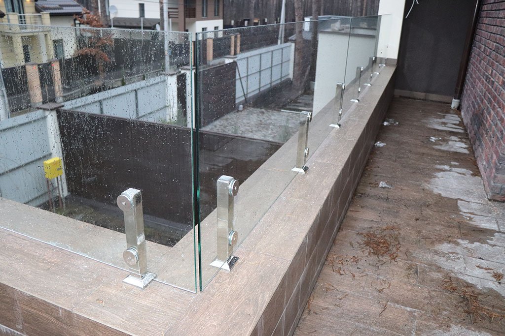 Для ограждений применяется закалённое стекло толщиной 8–12 мм или триплекс - многослойное стекло, в котором слои соединены прочной плёнкой. Закалённое стекло выдерживает серьёзные нагрузки и при разрушении раскалывается на безопасные мелкие фрагменты.