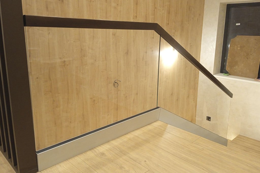 Поручень может быть накладным, выносным или отсутствовать вовсе - такие решения выполняют из утолщённого триплекса, который способен выполнять роль опорной кромки.